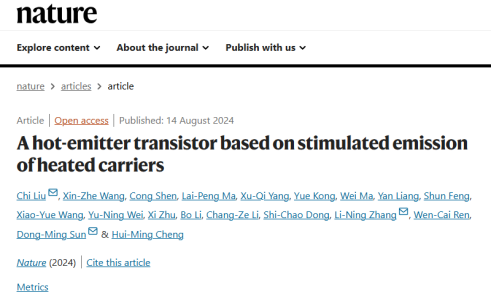 2024年8月14日,北京大学深圳研究生院信息工程学院张立宁课题组与中国科学院金属研究所的科研人员合作,在《Nature》联合发表了一篇题为“A Hot-Emitter Transistor based on Stimulated Emission of Heated Carriers”的研究论文。该研究成功报道了一种新机制的半导体器件,该器件成为热载流子晶体管家族的新成员,为后摩尔时代的低功耗和多功能器件设计提供了新的思路。
