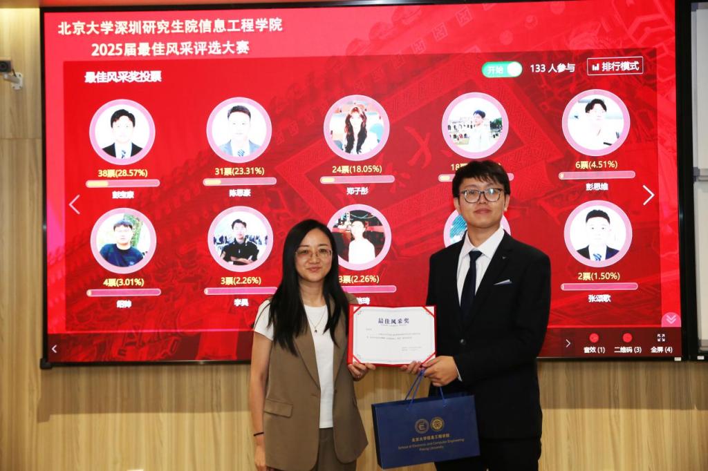 随后,经评审专家组综合评议,李玮琦、彭思维、金鹏、李昊、彭宝康、陈思豪、杨树州、张颂歌、张轩宇、郑子彤等10位同学凭借突出的学术创新性、研究深度和成果影响力,荣获2025年北京大学信息工程学院“学术之星”称号。颁奖环节中,杨玉超老师分别为获奖同学颁发荣誉证书,并合影留念。