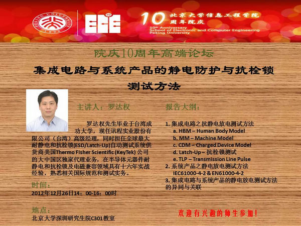 【信息工程学院院庆十周年系列讲座】罗达权经理:集成电路与系统产品的静电防护与抗栓锁测试方法